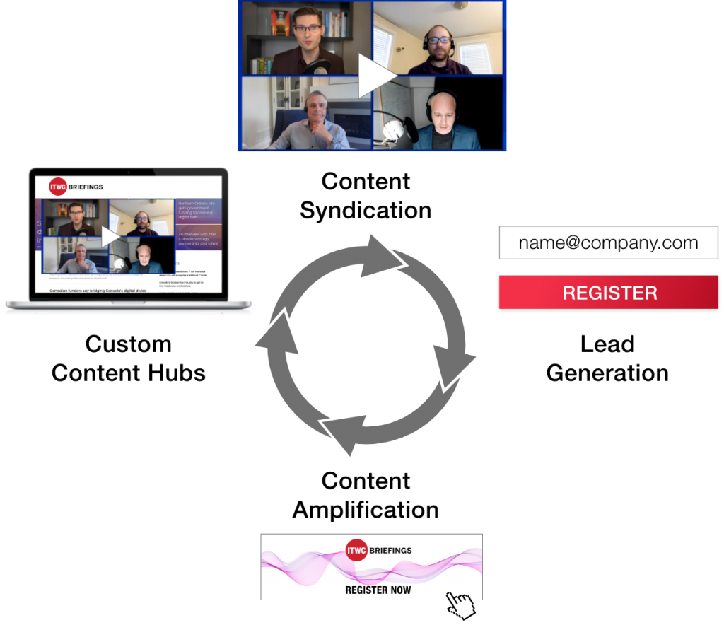 ITWC’s 4-Point Nurtured Lead Program begins by producing a lead gen asset or taking an existing one and turning it into a campaign that we amplify. Only leads that show interest will be invited to a half-hour virtual demo or conversation. A recording of the demo or conversation is repurposed as an online event.
